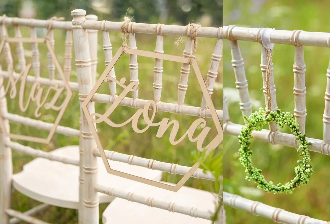 - Drewniane zawieszki z imionami pary - naturalny i elegancki akcent.